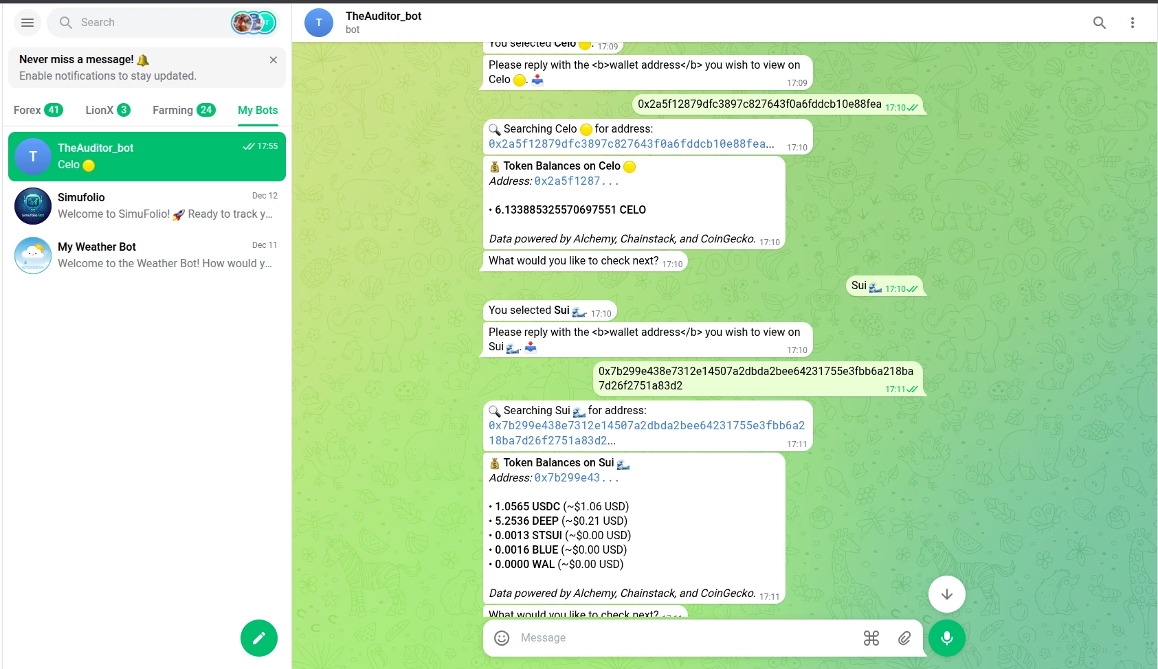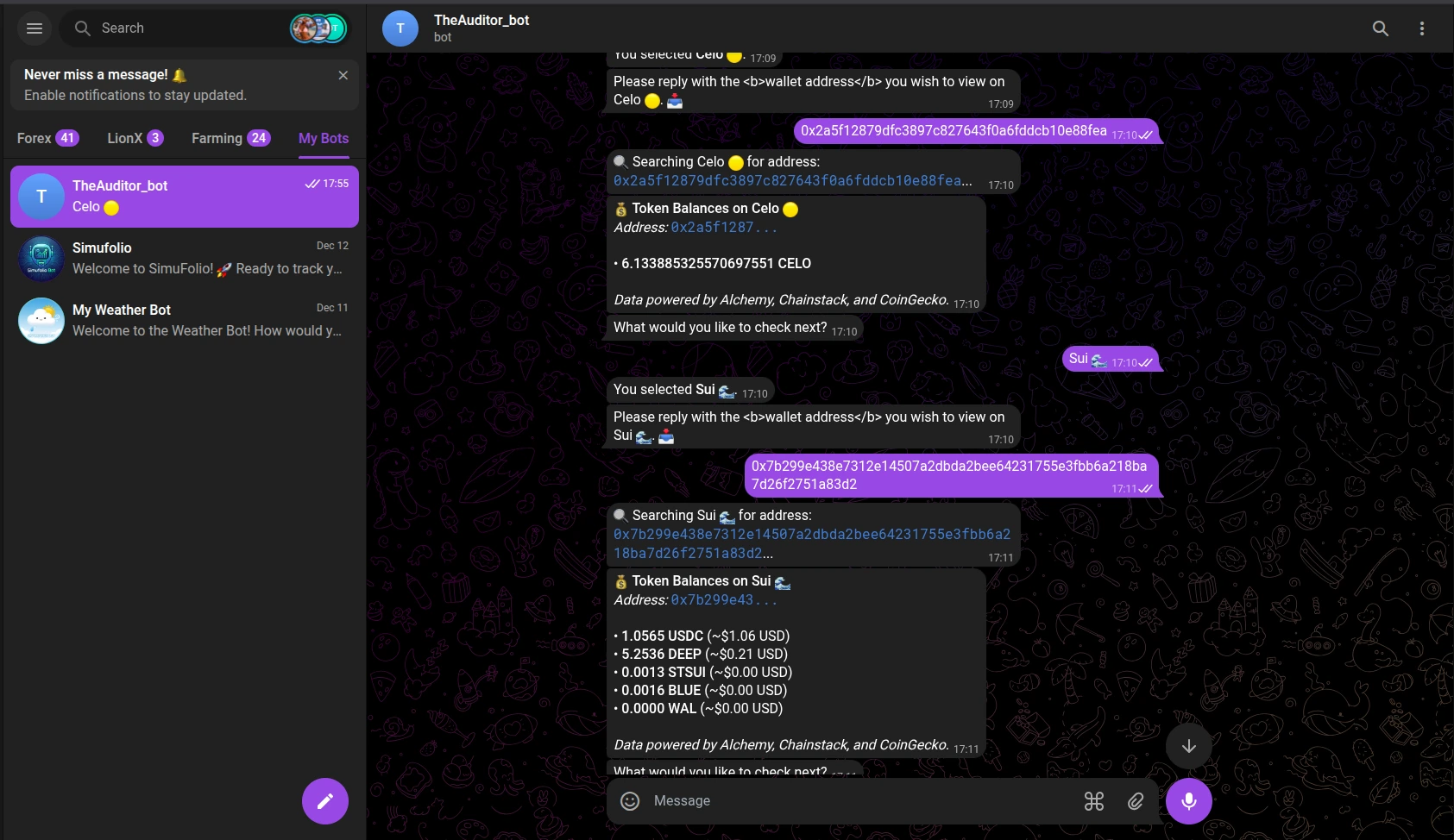 Now.Instantly audit your entire token portfolio on the Telegram platform.